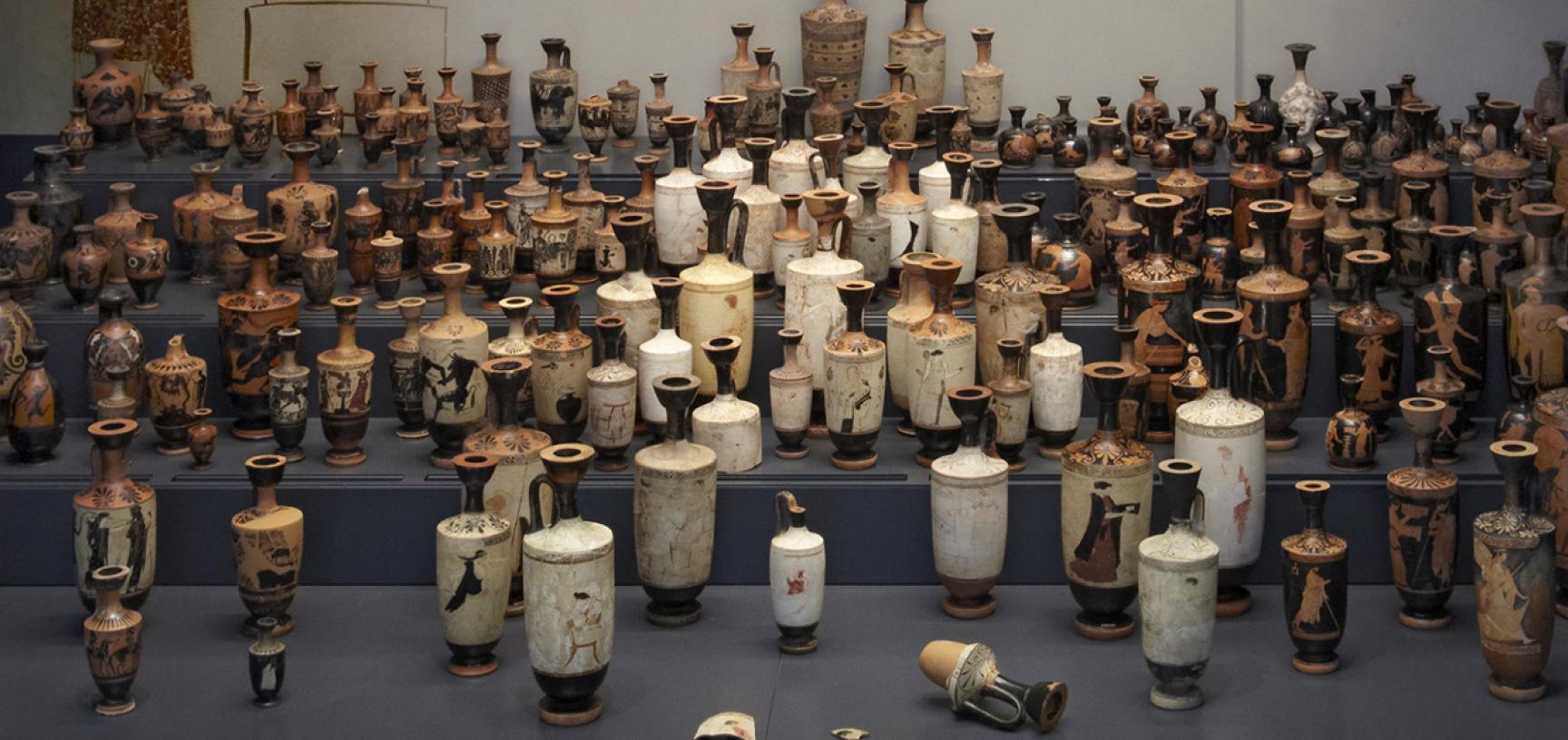 At the foot of the stairs to the rear of the gallery is a display of numerous decorated pottery oil jars (lekythoi) which were funerary vessels found in cemeteries all over the Greek world. These would have been buried alongside the dead or alternatively would have been set upright on the steps of grave monuments, brought by mourners as offerings. A broken pot shows how some were made with false interiors to reduce the outlay on expensive oil.