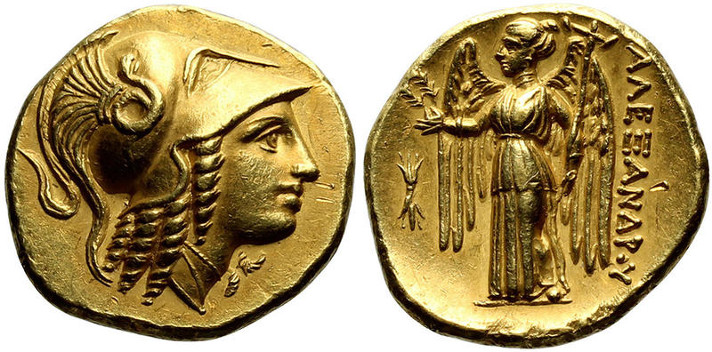 Ancient Greek gold coin showing Athena profile (obverse) wearing the triple crested Corinthian helmet and Nike standing (reverse) holding wreath and stylis, c. 332 BCE - 318 BCE